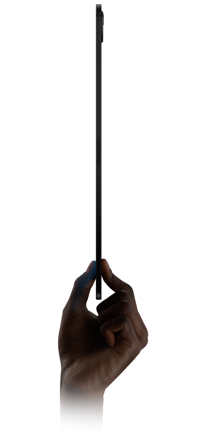 جهاز iPad Pro، الجزء الأمامي الخارجي، الوضع العمودي، لون أسود فلكي، شاشة تعرض رسماً رقمياً لشخصية بطابع مستقبلي ذات بشرة زرقاء وشعر مضفر، ويد تحمل iPad Pro من الأسفل بين الإبهام والسبابة لإظهار التصميم النحيف