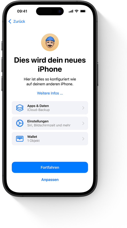 Stelle dein Gerät wieder her oder richte ein neues mit deinem iCloud Backup ein, um alle deine Fotos, Dateien, Kontakte, Apps, Einstellungen und mehr nahtlos zu übertragen, damit es sich genauso anfühlt und aussieht wie das vorherige Gerät.