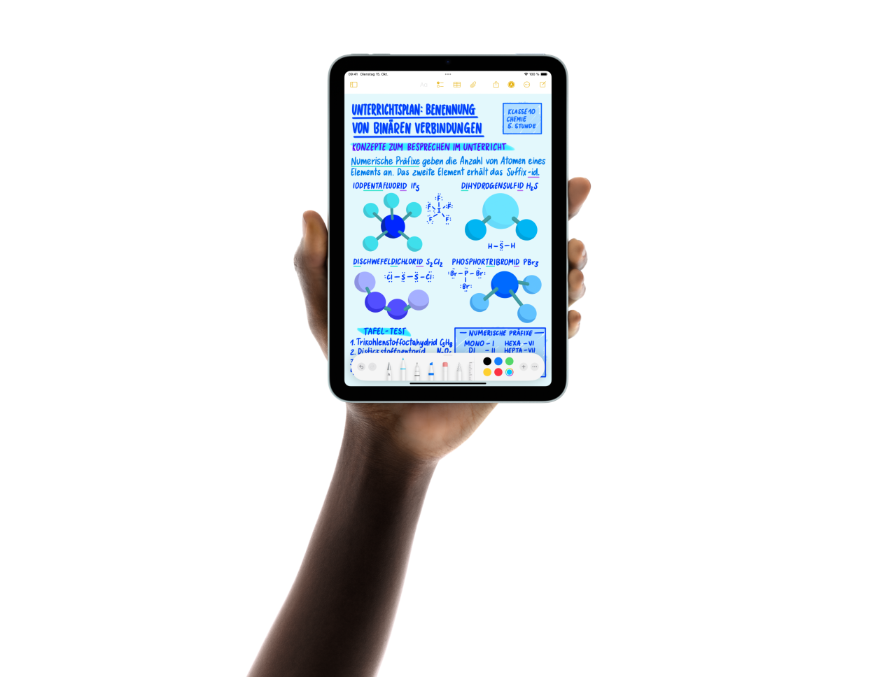 Fünf iPad mini Modelle werden in einer Fächerformation in den Händen gehalten. Ein Modell zeigt die Rückkamera, die anderen vier sind von vorne zu sehen. Mit dem Apple Pencil Pro werden Notizen gemacht.