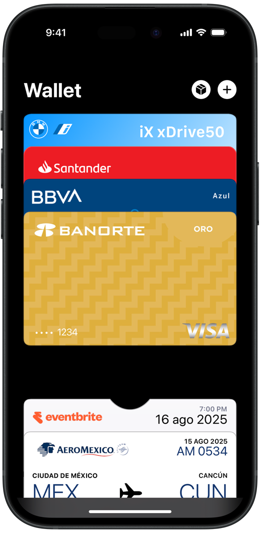segura y en un solo lugar tus tarjetas de débito y crédito, pases de abordar, boletos y más.